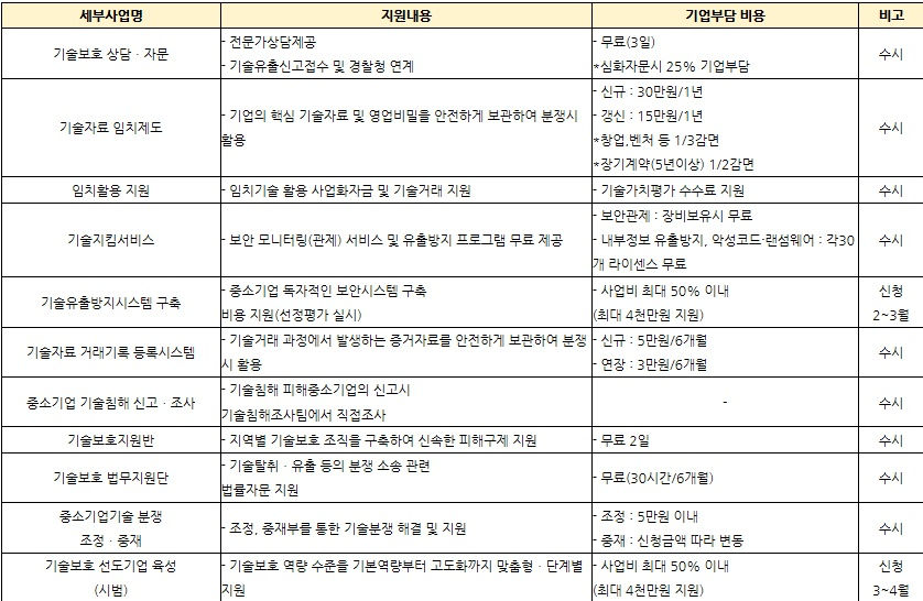 중소기업의 핵심기술 탈취, 유출 등을 근절하고 기술보호역량 수준 강화를 통해 기업 간 공정한 기술거래 환경을 조성하기 위하여 사전예방부터 피해구제까지 기술보호 전반에 걸쳐 종합적으로 지원해 드리는 사업입니다. ☞ 중소기업, 중견기업 등 세부사업별 대상 ☞ 기술보호 상담ㆍ자문, 기술자료 임치제도, 기술지킴서비스 등 지원